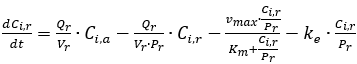 具有生物活性的复杂有机物或难溶组分的毒代动力学过程可能主要受膜渗透性或颗粒粒径的限制。且这些组分结构复杂,难以完全被体内生物酶系统代谢。针对大分子有机物和难溶组分的概念性方程可改写为式6的形式。Peff表示有效膜渗透性,即组分穿过生物膜的速率(m s-1),Sr是组织的表面积(m2),CLmФ和CLbile分别代表巨噬细胞清除速率常数和胆汁清除速率常数,示意该类组分在体内主要的清除途径。