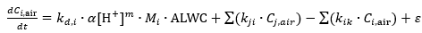 大气演化过程:在此仅考虑PM2.5组分之间的转化,式1考虑了影响主要毒性组分的溶解和氧化过程。式1左侧表示PM2.5组分(i)在大气中的浓度(Ci, air)随时间变化的速率。式1右侧的第一项描述了基于溶解动力学的过程,kd, i为表观一阶溶解速率常数,是温度、金属矿物固有性质和有机配体浓度的函数。式1的第二项和第三项分别描述了组分(i)在大气氧化条件下的生成和消耗,kji或kik对应组分(j)和(i)或组分(i)和(k)之间的表观一阶反应速率常数,其通常由实验拟合所得,反映了氧化性气体或自由基浓度、温度和颗粒物表面性质(如化学组成、表面结构、比表面积、表面粗糙度、表面官能团等)的影响。最后的残差项ε用于描述不确定性。