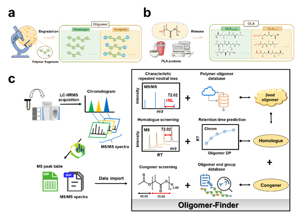 高分子材料的环境污染问题,如废弃橡胶和塑料,日益严重,已引起广泛关注。然而,相对于“热门”的微塑料,高分子低聚物并未得到应有的关注。低聚物是由2到40个重复结构单元组成的低聚合度分子,通常是高分子生产过程的副产物或降解中间产物,广泛存在于高分子产品中,并在使用或废弃过程中释放出来。团队先前的研究表明,生物可降解塑料聚乳酸(PLA)在人体消化酶的作用下可释放大量低聚物,并可能诱发肠道炎症(Wang et al., Nat Nano, 2023)。为深入揭示不同低聚物的环境行为和潜在危害,亟需建立高效的识别方法实现低聚物的精准鉴定和系统评估。