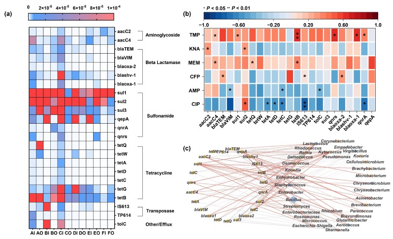 抗菌耐药性的排放:研究对 WCFs 排放的可吸入耐药基因组展开全面评估。不同 WCFs 的耐药细菌浓度差异明显,在 31.2 - 204.8 CFU・m⁻³ 之间波动,办公大楼和郊区的 WCFs 浓度较高,农村较低。经随机挑取单克隆并进行Sanger测序,耐药细菌主要是芽孢杆菌、葡萄球菌和不动杆菌属,其中部分为致病或潜在致病菌株,可能威胁公众健康。此外,研究发现多数采样点存在多种耐药基因(ARGs),如 β - 内酰胺类和四环素类。城市地区 WCFs 中 ARGs 的检出率和丰度略高于郊区与农村,或与城市人口密度、垃圾量及抗生素使用频率有关。同时,居民区和高档区 WCFs 的移动遗传元件(MGEs)丰度显著更高,意味着这些区域 ARGs 传播潜力更大。网络分析表明,氨基糖苷类和磺胺类耐药基因可能通过垂直基因转移在空气中传播,ARGs、MGEs 与优势细菌属共存暗示了水平基因转移的可能性。