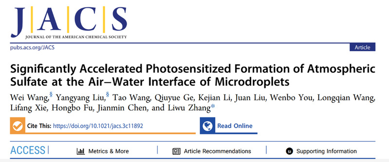 近日,调教小说 张立武课题组在大气化学领域取得重要研究进展。该团队综合运用了尺寸可控的微液滴打印技术、纳秒级高分辨瞬态吸收光谱、共聚焦表面增强拉曼散射(SERS)技术、分子层面的密度泛函理论(DFT)计算以及数值模拟等先进手段,对大气中气溶胶的气-液界面效应对二次硫酸盐形成机制的影响进行了深入研究。他们的研究成果揭示了在气-液界面上,半溶剂化环境能显著加速大气中的光敏化氧化反应,这一发现为理解大气光敏化氧化过程提供了新的视角。研究成果以“Significantly Accelerated Photosensitized Formation of Atmospheric Sulfate at the Air–Water Interface of Microdroplets”为题,于近日发表在Journal of the American Chemical Society期刊上。