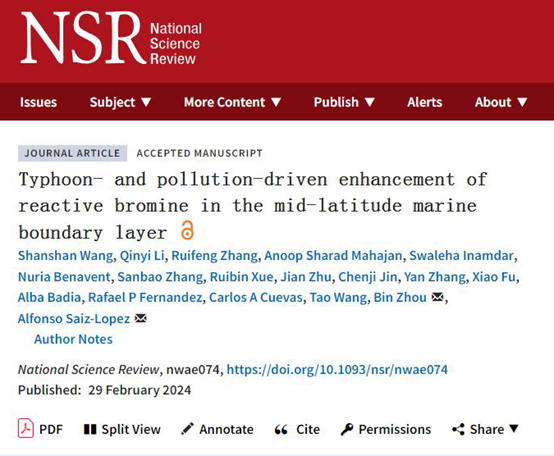 近日,调教小说 王珊珊副教授、周斌教授课题组与西班牙国家研究委员会Alfonso Saiz-Lopez教授团队合作在《国家科学评论》(National Science Review)上发表了题为“Typhoon- and pollution-driven enhancement of reactive bromine in the mid-latitude marine boundary layer”的论文。该论文揭示了台风天气和空气污染对中纬度海洋边界层中活性溴含量的显著影响,为此前被低估的活性溴在大气化学、区域空气污染和全球气候变化中的作用带来了新的见解。调教小说 王珊珊副教授和西班牙国家研究委员会/香港理工大学/山东大学的李沁怡博士为第一作者,调教小说 周斌教授和西班牙国家研究委员会的Alfonso Saiz-Lopez教授为通讯作者。