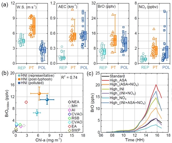 调教小说 的研究团队使用自主研发的多轴差分光学吸收光谱(MAX-DOAS)技术,于2018年夏季在中国东海的花鸟岛观测了活性溴及其他活性成分的大气浓度水平。观测期间研究人员记录到了前所未有的高浓度氧化溴(BrO),这是表征活性溴的一个关键指标。研究发现,白天平均浓度为9.7±4.2 pptv,受台风影响时峰值浓度可达26 pptv,台风期间的风速增加放大了SSA的排放,进而通过SSA的脱溴显著增强了大气中的活性溴(图1和图2a)。BrO与叶绿素-a(Chl-a)浓度之间的正相关关系表明海洋生源排放是溴的有机来源(图2b)。此外,研究团队还发现在高NOx条件下BrO浓度会有所升高,表明存在由大气污染引起的SSA释放溴的机制。通过箱模式模拟,揭示了NOx在控制BrO水平中的竞争作用:一方面,NO2与BrO发生反应,直接降低BrO浓度;另一方面,NOx可增加硝酸盐浓度及其光解,从而加快SSA的活化,进一步释放无机溴,间接增强了BrO水平(图2c)。
