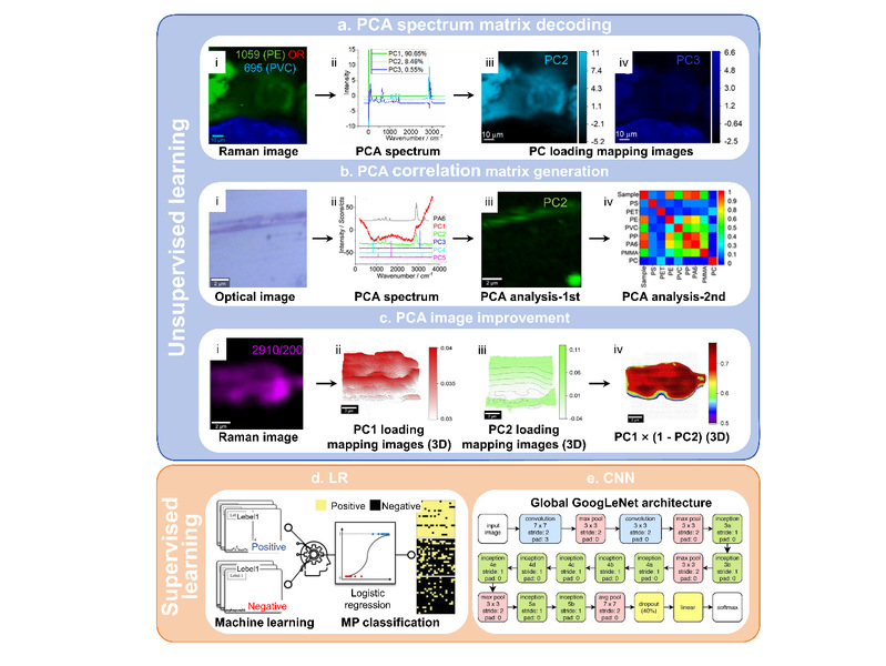 图1. 主成分分析(PCA)及其高级变体、逻辑回归(LR)和卷积神经网络(CNN)在解码拉曼光谱矩阵中的应用。(a)通过逻辑或合并两个特征峰的拉曼图像(i)、PCA提取的与拉曼光谱(PC1-PC3)相似的光谱轮廓(ii)以及PC2(iii)和PC3(iv)的载荷图。(b)样品的光学图像(i)、PC1-PC5的PCA光谱与强度偏移后的PA6拉曼光谱的比较(ii)、PC2的载荷系数图(iii)和第二轮PCA所获得的相关矩阵(iv)。(c)2910 cm-1处的拉曼强度图(i)、PC1(ii)和PC2(iii)的PCA图,以及使用“PC1×(1-PC2)”合并并调整颜色偏移的二维图像(iv)。(d)用于将拉曼图转换为数字信号的LR模型。(e)基于GoogLeNet架构的CNN。