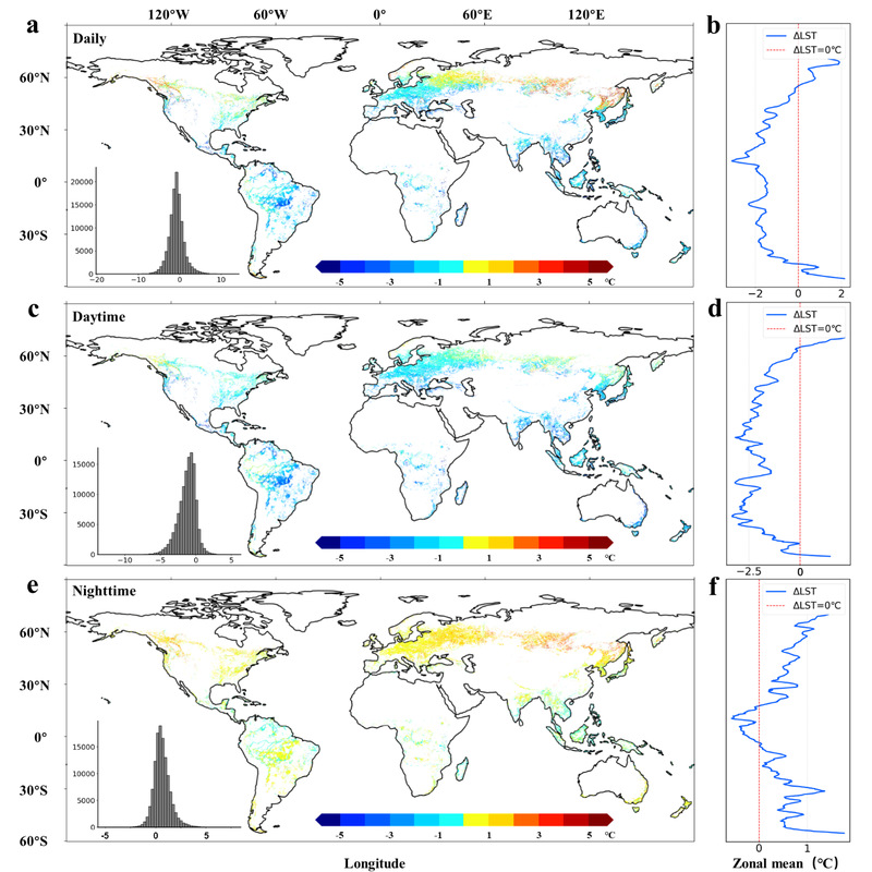 图1 全球地表温度变化(ΔLST)的分布及纬度趋势。
