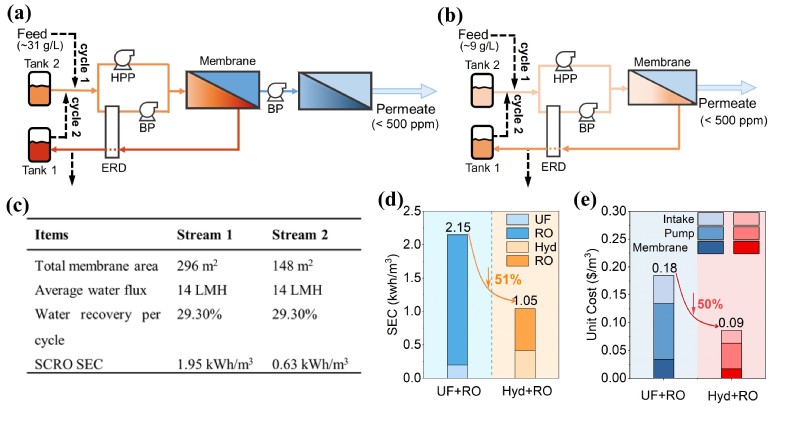 此外,研究团队还创新设计了水凝胶-反渗透(RO)集成系统,将水凝胶体系作为反渗透工艺的前处理手段,显著降低了反渗透阶段的运行压力和能耗,整体节能幅度达51%。与传统超滤-反渗透系统相比,该方案在膜组件投资和维护成本上也有显著降低,可有效延长膜寿命并减少结垢风险,展现出极具市场竞争力的经济和环境双重效益。