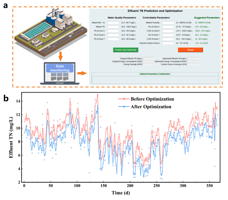 图6. 基于机器学习模型的强化脱氮、节能及COD投加量优化的应用:(a)机器学习模型的应用指导与参数优化;(b)运行参数优化前后一年内出水总氮(TN)浓度变化。