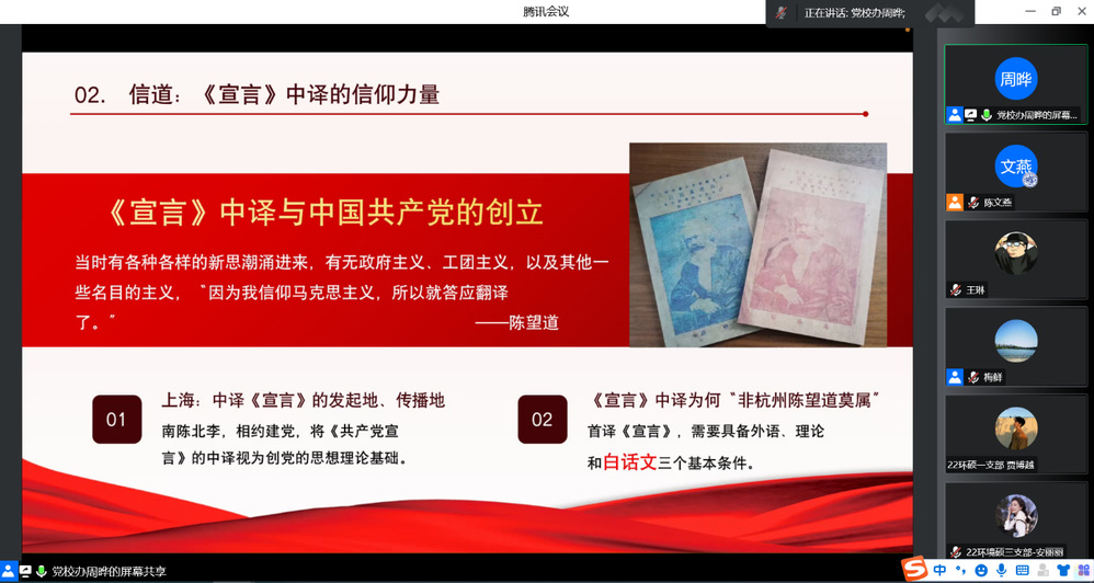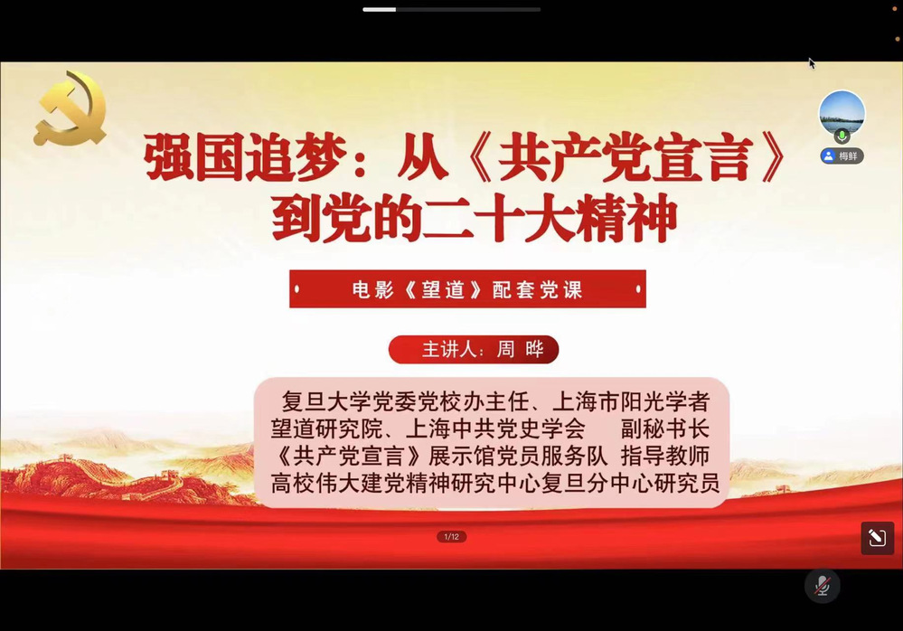 周晔以“强国追梦:从《共产党宣言》到党的二十大精神”为题,聚焦《共产党宣言》及其中文首译者陈望道先生践行党的初心与使命的人生旅程。周晔从《望道》电影开始,从《望道》电影结束,带领全体师生回顾了《共产党宣言》首个中文全译本翻译者——陈望道先生的一生,从寻道、信道、传道、弘道四个方面追溯了中国人追求真理的风雨历程。周老师结合生动的讲述和电影片段,带领大家深化对《宣言》的学习与理解,加深了对“真理之甘·信仰之源”深刻内涵的认识和体悟,鼓励大家要做《宣言》精神忠实传人,传承红色基因,牢记习近平总书记“心有所信,方能行远”的谆谆教诲。