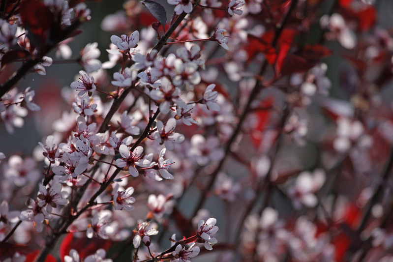 蔷薇科李属灌木;叶片椭圆形、卵形或倒卵形,紫红色;