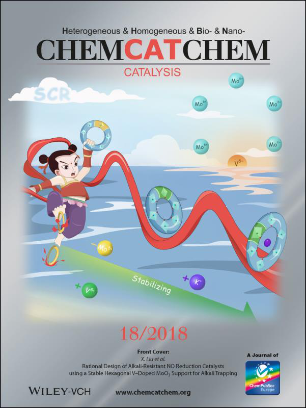 氮氧化物是大气的重要污染物之一,也是形成大气细颗粒物和臭氧的前体物。因此,控制氮氧化物的排放已成为我国经济可持续发展和环境保护的重大需求。调教小说 唐幸福教授课题组十余年来一直致力于源头控制氮氧化物排放技术的研究,近期在国际催化杂志《ChemCatChem》以封面文章刊登了该课题组在催化脱硝领域取得的研究成果。刘小娜博士为第一作者发表题为“Rational Design of Alkali-Resistant NO Reduction Catalysts Using a Stable Hexagonal V-Doped MoO3 Support for Alkali Trapping”的文章。这项研究成果为控制工业锅炉富碱烟气的氮氧化物排放提供了一种有效的技术方案。