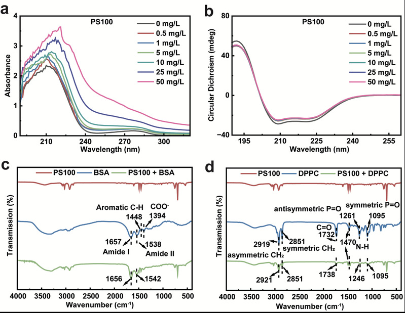 图4:PSNPs与肺表面活性剂的相互作用机制:BSA与不同浓度PS100相互作用的(a)UV-vis光谱和(b)圆二色光谱;(c)PS100、BSA以及BSA与PS100作用混合物的FTIR光谱;(d)PS100、DPPC以及DPPC与PS100作用混合物的FTIR光谱。
