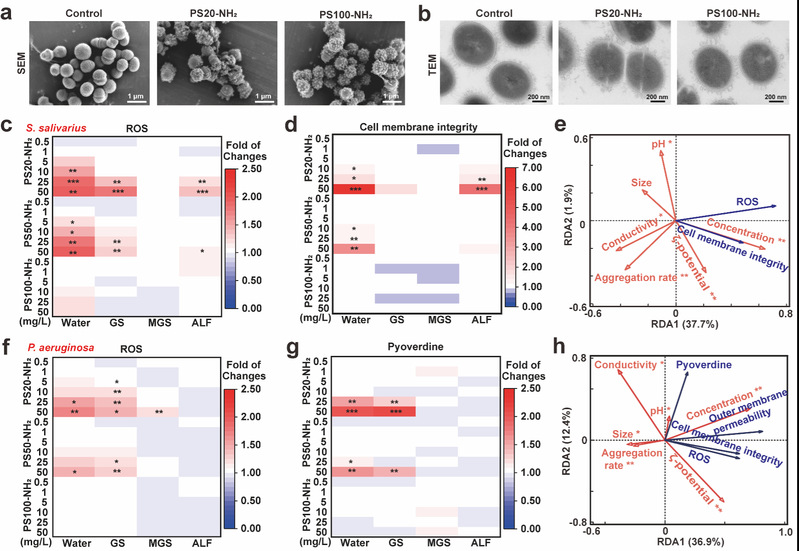 图5:PSNPs对肺部原生细菌和机会性致病菌的影响:PSNPs处理前后唾液链球菌的(a)SEM和(b)TEM图像;PS-NH2在不同环境(Water,GS,MGS和ALF)中对唾液链球菌(c)ROS生成和(d)细胞膜完整性的影响;(e)环境变量(ζ电位、凝聚速率、粒径、浓度、pH值和电导率)与唾液链球菌反应(ROS和细胞膜完整性)之间的冗余分析;PS-NH2在不同环境(Water,GS,MGS和ALF)中对铜绿假单胞菌(f)ROS生成和(g)绿脓菌素生成的影响;(h)环境变量(ζ电位、凝聚速率、粒径、浓度、pH值和电导率)与铜绿假单胞菌反应(ROS、细胞膜完整性、外膜通透性和绿脓菌素)之间的冗余分析。