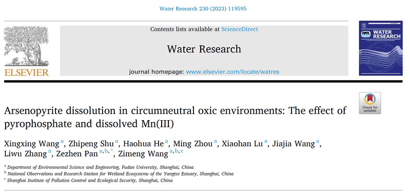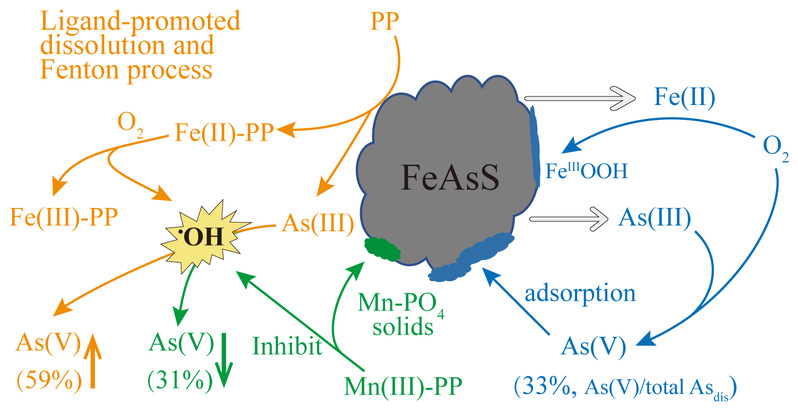 砷作为一级致癌物,其对地下水的污染已经使全球数百万人的生命健康受到威胁。人为源和自然源的砷共同造成了高浓度的地下水砷含量,硫化砷矿物的溶解被认为是砷释放到地下水环境中的一个重要原因。在Mindat矿物数据库中已发现的三百多种含砷硫化矿中,砷黄铁矿(也叫毒砂矿)是在自然界中最为常见的,并且广泛存在于废弃的尾矿中。砷黄铁矿的氧化产物包括硫酸、亚砷酸盐(As(III))和砷酸盐(As(V)),是地表径流和酸性矿山废水(acid mine drainage,AMD)中砷污染的重要源头。砷黄铁矿还普遍存在于地下环境中,受自然破坏、季节性地下水位的波动或人为活动(如管理的含水层补给带来氧化剂)的影响,砷黄铁矿的氧化溶解会变成不可忽略的砷污染来源。因此,研究砷黄铁矿的溶解行为对于深入了解砷的地球化学归趋和其地下水污染的有效控制等方面具有重要意义。此外,溶解态Mn(III)因其较强的氧化还原活性受到了广泛关注,但Mn(III)在与铁和氧共存的复杂多元体系中对天然来源砷的释放过程及其转化的作用尚不清晰。基于此,调教小说 水土界面过程研究团队探究了溶解态Mn(III)对砷黄铁矿溶解的影响,相关成果以“Arsenopyrite dissolution in circumneutral oxic environments: the effect of pyrophosphate and dissolved Mn(III)”为题发表于Nature Index指数期刊Water Research期刊://doi.org/10.1016/j.watres.2023.119595。
