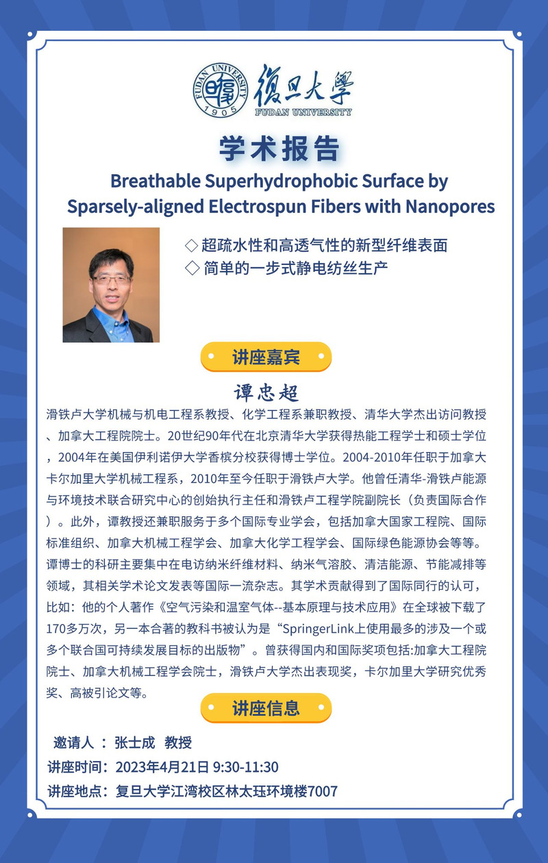 【学术报告】Breathable Superhydrophobic Surface by Sparsely-aligned Electrospun Fibers with Nanopores