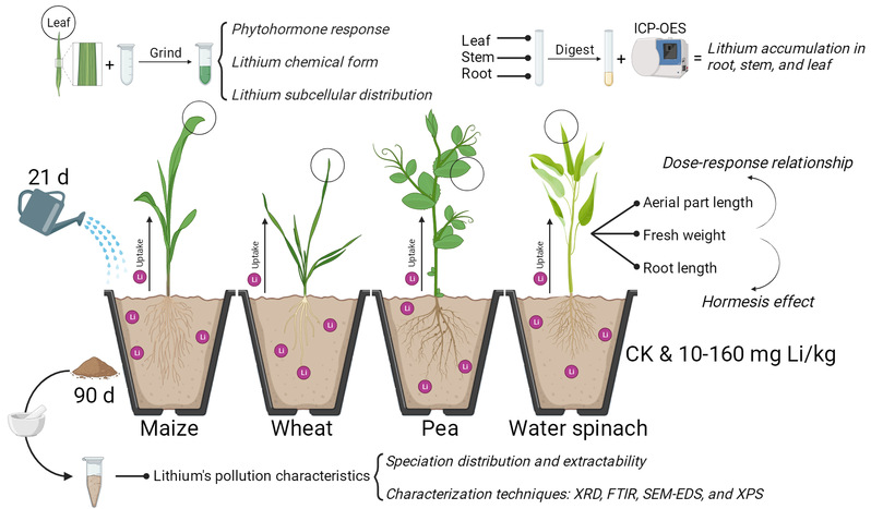 2024年8月20日,调教小说 王祥荣教授城市生态学研究团队在国际著名学术刊物Environmental Science & Technology上在线发表了题为“Integrated Analysis of Pollution Characteristic and Ecotoxicological Effect Reveals the Fate of Lithium in Soil-Plant Systems: A Challenge to Global Sustainability”的研究论文。锂具有优异的电化学性能,在锂电池生产中起着举足轻重的作用。然而,在人为因素的作用下,锂成为了环境介质中的新污染物。该研究利用多物种、多参数和多技术方法,以玉米、小麦、豌豆和蕹菜作为模式物种,模拟并构建土壤-植物系统,对锂的污染特征和生态毒理学效应进行了系统的评估。研究结果揭示,锂以无定形状态持续存在于土壤表面,能够改变表面功能基团和化学键,同时锂具有较高的迁移性,弱酸提取态锂占外源锂的29.66%~97.02%,但少量的外源锂倾向于形成残渣态组分。植物分析表明,经过21天的培养后,10~80mg/kg的锂能够显著促进玉米和豌豆的生长,但抑制四种植物地上部长度的LC50为173.58~315.63 mg Li/kg,整体表现出“低促高抑”的毒物兴奋作用。锂在四种植物叶片中的富集量至高达1127.61~4719.22 mg/kg,其无机态组分占18.60%~94.59%,细胞质组分占38.24%~89.70%。随着处理水平的增加九种植物激素含量呈现先上升后下降的动态趋势,PLS-SEM模型分析继而表明锂对植物的生长刺激作用可能与其对植物激素水平的影响有关。进一步又发现,蕹菜表现出较优异的锂富集能力和胁迫耐受性,有希望在未来成为潜在的修复物种。该研究有助于更全面地理解锂在土壤-植物系统中的环境行为,数据和结果将有利于理解、发现和应对全球可持续发展下锂带来的新挑战。