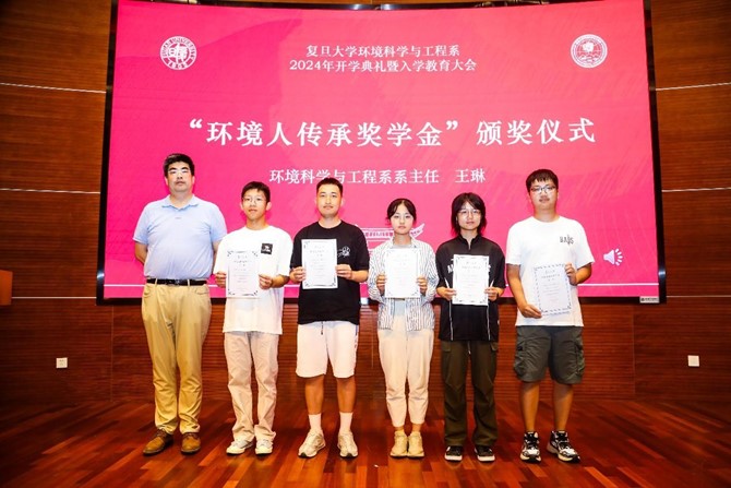 “环境人传承奖学金”在校友的支持下设立,旨在为有志于从事环境领域研究的本科生提供更多支持,激励优秀学子投身环境事业。系主任王琳为李乐彤、郭雨轩、李银毅、李奕蒙、黄泽宇等五位同学颁发“环境人传承奖学金”。