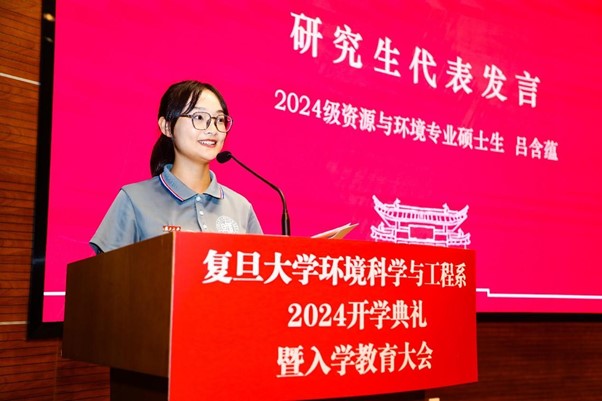 2023级本科生郭雨轩作为本科生代表发言,他回顾了选择环境专业的初衷,来自大山深处的他从小就对大自然特别亲近,进入复旦后,从参观实验室、修读通识课程,到参加 “环境人节”志愿服务,他对环境专业的认识和热爱不断加深。他立志不断努力,提高专业素养,未来投身环保事业,为保护美丽家园贡献自己的力量。