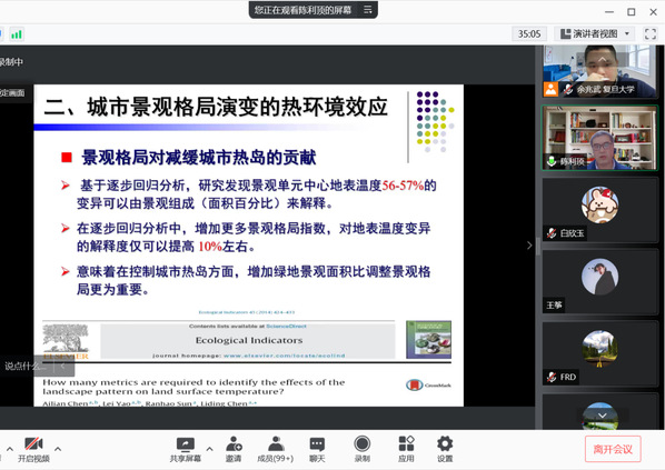 2021年12月22日晚,中国科学院生态环境研究中心陈利顶研究员(杰青)在调教小说 余兆武老师的邀请下进行了题为“城市景观演变的生态环境效应”的学术报告,作为调教小说 25周年系庆系列报告。陈利顶研究员是城市与区域生态国家重点实验室主任。现任政协第十三届全国委员会人口资源环境委员会委员,国际景观生态学会副主席;中国生态学会副理事长。