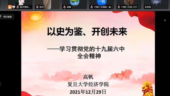 高帆教授以《以史为鉴、开创未来——学习贯彻党的十九届六中全会精神》为题,从“六中全会的召开及内容”、“《决议》的框架和内容”和“学习贯彻六中全会精神”三个方面展开讲解。党的十九届六中全会是在“两个一百年”奋斗目标历史交汇点上召开的一次重要会议,全会审议通过了《中共中央关于党的百年奋斗重大成就和历史经验的决议》。高帆教授结合自身专业特点,从经济学角度讲述了党的百年奋斗的重大成就和历史经验,从深刻认识党百年奋斗历程、成就和经验等六个方面学习贯彻六中全会精神。报告以《决议》最后一句话结尾,号召大家以史为鉴、开创未来,埋头苦干、勇毅前行。整场报告主题鲜明,逻辑性强,对广大师生进一步把握和理解全会精神有很大指导和促进作用。