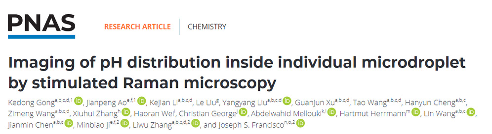 物理系季敏标教授、宾夕法尼亚大学Joseph S. Francisco教授等国内外十余个团队合作,通过受激拉曼和活度理论实现了微液滴气溶胶内部pH分布的高分辨成像,采用无接触式的探测方法证明了气溶胶内的pH梯度存在,并表明该pH梯度具有尺寸依赖性。相关研究成果以“Imaging of pH distribution inside individual microdroplet by stimulated Raman microscopy”为题,以直接投稿的方式,发表在国际知名综合性期刊Proceedings of the National Academy of Sciences of the United States of America(2023, 120, e2219588120)上。