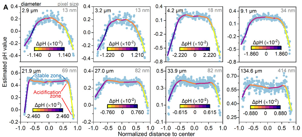 图3. 微液滴尺寸对其内部pH分布的影响
