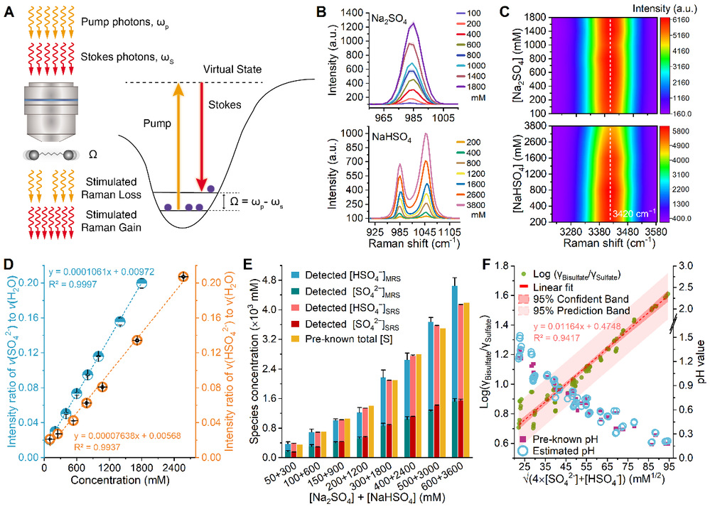 首先,研究人员测量了硫酸根和硫酸氢根标准溶液的SRS光谱,以建立[SO42-]和[HSO4-]的标准曲线。并通过内标法以校正微滴的几何形状等因素对定量结果的影响。在此基础上,结合酸度的定义和活度理论,得出了通过硫酸根和硫酸氢根浓度来计算pH值的分析表达式,并通过了热力学模型的评估验证。(图1)