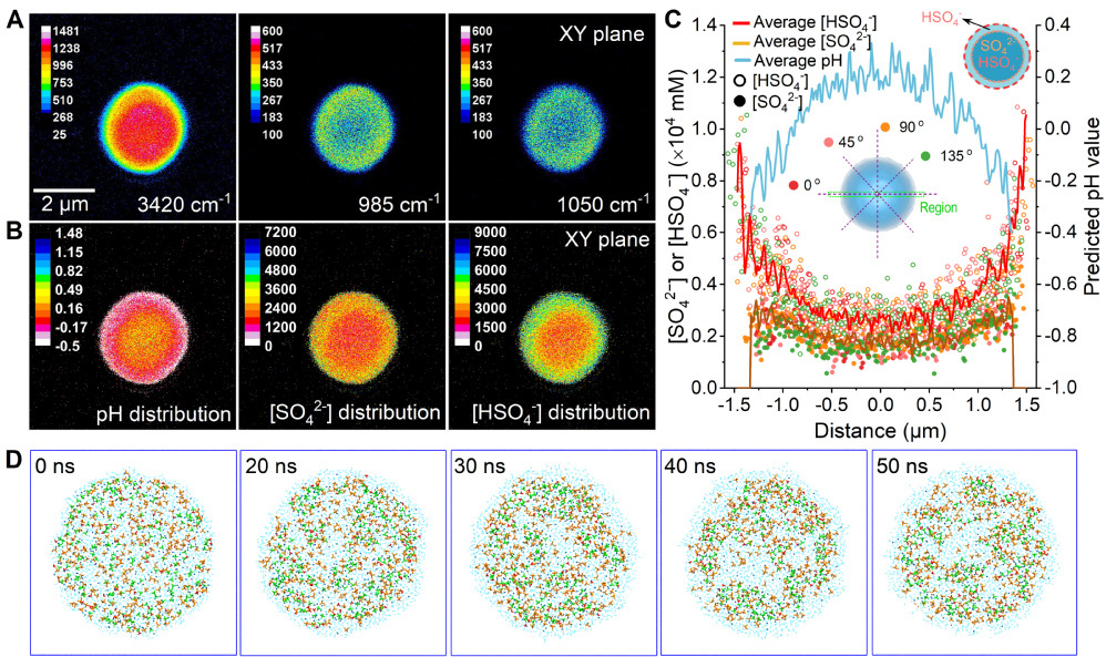 研究人员基于该方法表征了直径为2.9μm的微滴气溶胶的pH值分布,发现硫酸根、硫酸氢根和氢离子都表现出强烈的界面富集趋势,其浓度从微液滴中心到边缘单调增加,呈中心对称分布。研究人员进一步通过经典的分子动力学模拟研究了这种分布,表明在分布均匀的微滴气溶胶内,硫酸根、硫酸氢根和氢离子向液滴边缘迁移,在40纳秒后达到相对稳定的分布。(图2)