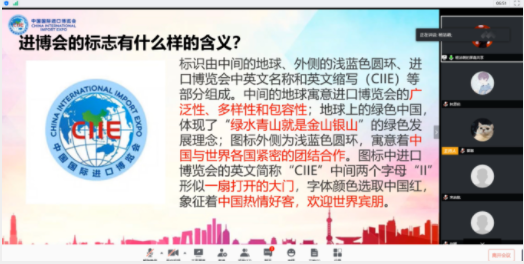 首先主讲人杨洁萌老师向学员们普及了关于进博会的小知识,通过与广交会的区别详细阐述了什么是进博会、进博会的口号“新时代 共享未来”、标志、吉祥物“进宝”,以及举办进博会的深层意义。