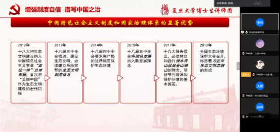 最后,三位支部书记进行总结。硕士生第一党支部副书记杨鸣凤发言表示,本次疫情很好地体现了集中力量办大事的制度优势,不仅有效控制住了国内疫情,还向国外提供了医疗人员和物资的援助;近年来我国生态文明建设在多方面取得了明显成效,彰显了我国制度优势,我们研究生同学要自觉树立制度自信。硕士生第二党支部书记肖茗明表示虽然我们宅家抗疫,但不能抗疫不能阻碍大家学习和科研的脚步,号召大家继续加强线上交流,例如可以分享学习技巧、组织线上共同学习。博士生党支部副书记陈亚男提到在张弛老师的指导下,同志们学习到了生态文明建设的具体细节,我们研究生党员要把握我国的制度优势并树立制度自信,加强科研领域的探究,强化建设美丽中国的责任担当。