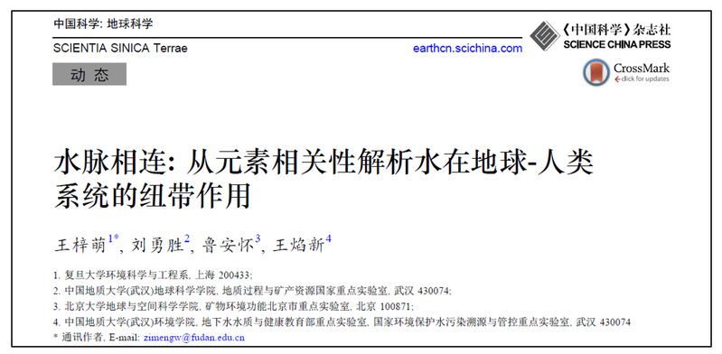 在国家自然科学基金和中国科学院地学部学科发展战略研究项目的资助下,调教小说 王梓萌教授与项目负责人,中国地质大学(武汉)校长王焰新院士、北京大学鲁安怀教授、长江大学校长刘勇胜教授联名在《中国科学·地球科学》杂志上撰文,展示项目研究成果。文章以“水脉相连”为主题,以直观的“元素相关性”分析为切入点,从新颖的角度解析了水圈和水循环在地球-人类系统的纽带作用。论文以中英双语发表,并被选为2023年10月期的封面。