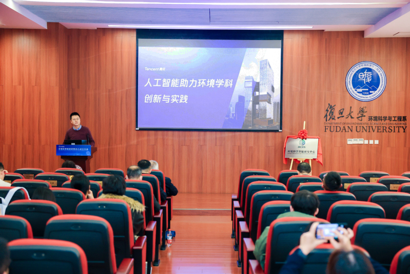 姜育刚副校长、俞汉青院士、施敏处长、王琳主任共同为环境科学智能研究中心揭牌。四家人工智能领域科技企业和复旦环境系共建环境科学智能实践基地,启动产学研深度融合,陈建民教授、张立武副主任为四家企业授牌。