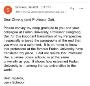 在我的译文最后,戴教授还撰写了一段关于《芬尼根的守灵夜》,Jim Morgan,科学技术,与人类文明”的精彩评论。“利菲河是都柏林的灵魂之河,Jim Morgan教授的一生也是水化学领域的灵魂源泉。正因为人类历史上有无数Jim Morgan这样的智者和导师,才有科学、技术和文明的薪火相传。” 更是点睛之笔。我们的翻译发表之后,我告诉Jerry Schnoor院士《芬尼根的守灵夜》的中文首译者、调教小说 的戴从容教授也参与了翻译。他十分惊喜。他在回复我和戴教授的邮件里这样写到:“翻译我的纪念文章的人来自著名的调教小说 ,是我的荣幸。我没有想到,这位致力于研究詹姆斯·乔伊斯的学者,就跟你同在一所大学。调教小说 ,不愧是世界顶尖的大学。”