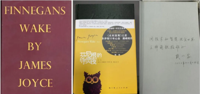 图3. 詹姆斯·乔伊斯《芬尼根的守灵夜》与戴从容教授的中文首译版,以及内页上对笔者的寄语