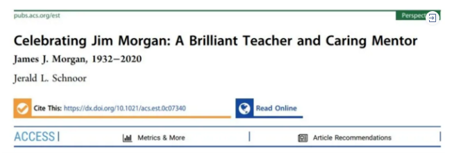 2020年9月19日,国际水化学学科的奠基人之一,斯德哥尔摩水奖得主,美国工程院院士,加州理工学院荣休教授 James Morgan与世长辞,享年88岁。10月30日,Jim Morgan教授生前好友、美国工程院院士Jerry Schnoor撰写了一篇纪念文章发表在Morgan生前创办的ACS旗下刊物Environmental Science & Technology上,将收录在James Morgan Tribute Issue。笔者第一时间拜读该文,深受前辈事迹的感动。回想自己与老先生晚年有过一段学术上的请教,如获感召,随即联系Jerry Schnoor院士和现任主编、耶鲁大学的Julie Zimmerman教授,主动请缨将这一篇纪念文章翻译成中文。在美国化学会的授权下,中文翻译于12月16日发表在《ACS美国化学会》微信公众号上,并被多家自媒体转载。近日,重读旧文,思绪万千,想与公众号读者朋友分享。