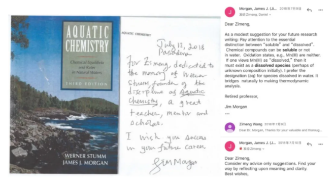图1. Jim Morgan和他的恩师Werner Stumm生前合著的教材《Aquatic Chemistry》,内页上对笔者的寄语和晚年与笔者的通信
