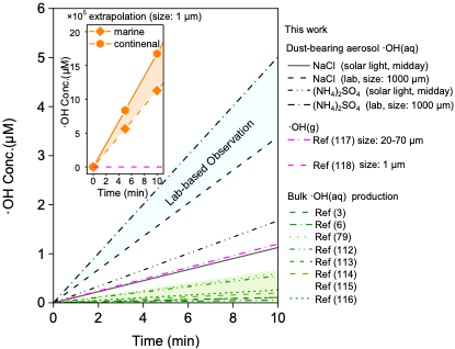 图3. 在典型云滴寿命期间,含矿物微滴气溶胶和云滴中累积形成的·OH。