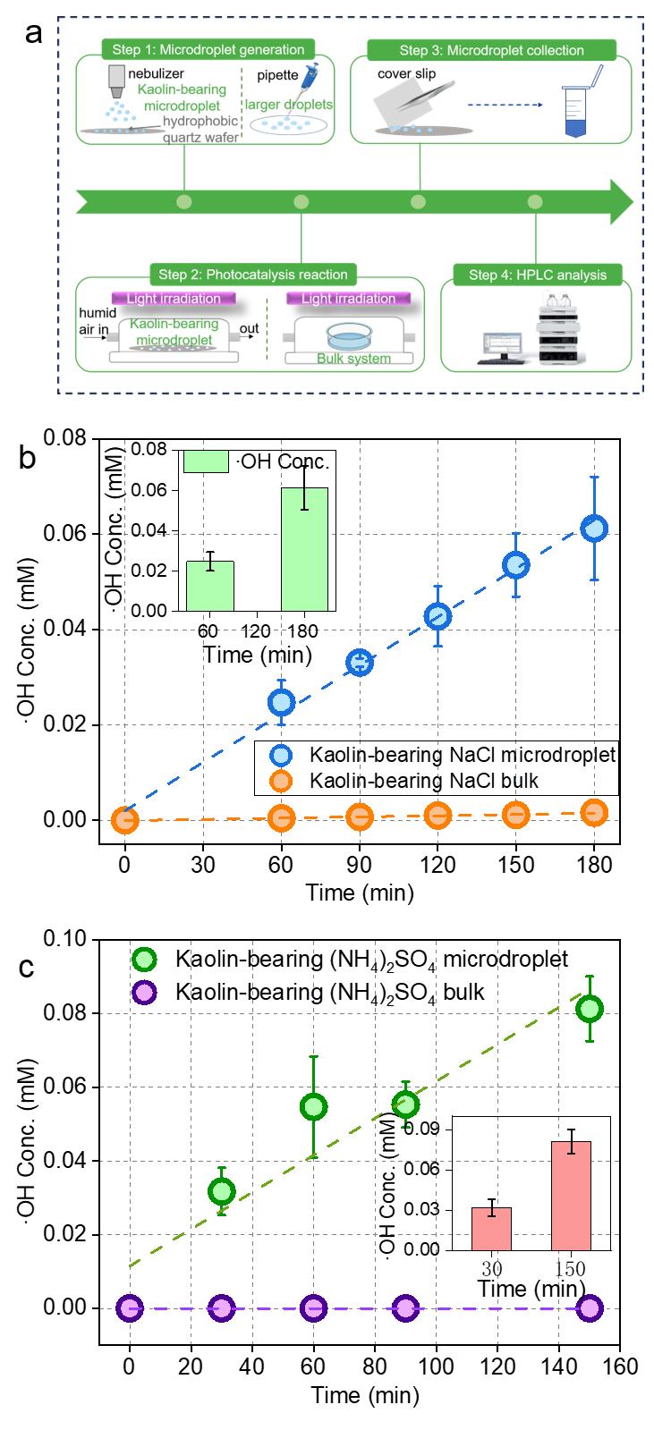 图1. (a) 含高岭土的微液滴和体相溶液中·OH浓度测定的实验装置示意图。(b) 含高岭土的NaCl微液滴和体相溶液中·OH的光化学形成。 (c) 含高岭土的NH4(SO4)2微液滴和体相溶液中·OH的光化学形成。