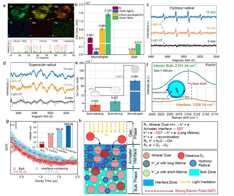 2. (a) 高岭土的 SEM-EDX XRD 图。 (b) 不同反应条件下,含高岭土的气溶胶微滴和体相中·OH的生成。(c) ·OH(d) ·O2-ESR图谱。(e)在有无搅拌的条件下,含高岭土的体相溶液以及相应的微滴气溶胶体系中·OH的生成。(f)在含高岭土的NH4(SO4)2微液滴的气-液界面和内部测量的拉曼位移(CN)D =~450 μm(g) 含界面区域和体相溶液中光生空穴的寿命。(h)含矿微滴气溶胶加速 ·OH 光化学生成的机制示意图。