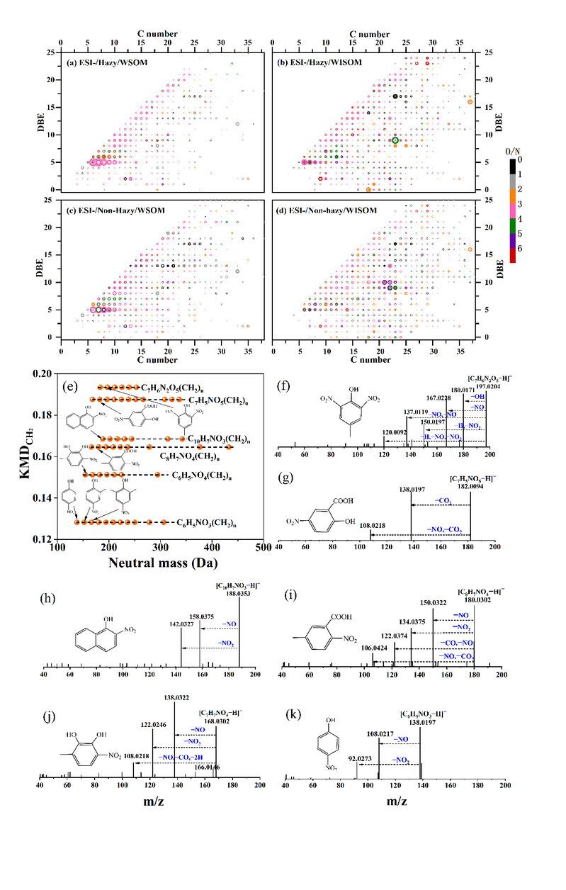 图3. 霾天(a,b)和非霾天(c,d)在ESI(-)中检测到CHON化合物的键当量(DBE)和C数。颜色条表示CHON化合物的氧氮比,而标记大小与每种化合物丰度的五次方的平方根成正比。(e)含O/N≥3的CHON化合物的CH2-Kendrick图。常见NACs主要CH2族物种的代表性MS/MS破碎谱(f-k)。