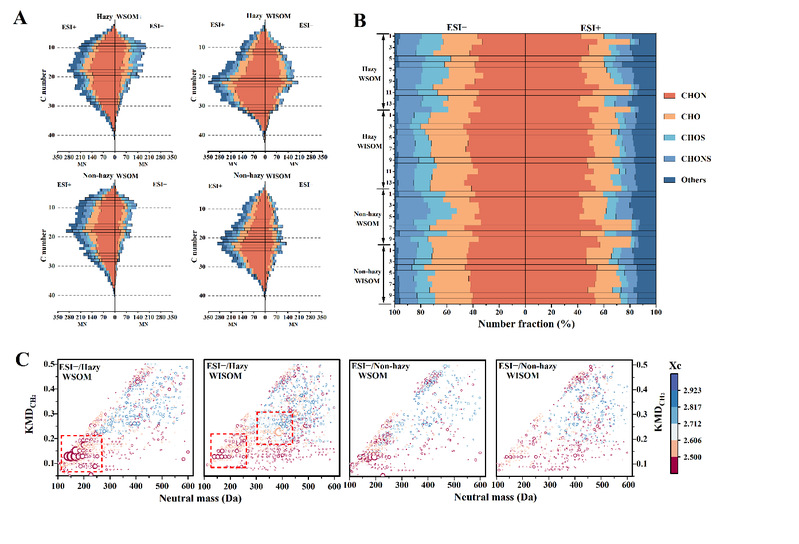 图1. 霜样分子特性综述 (A)霾天和非霾天ESI(+)和ESI(-)模式下霜样WSOM和WISOM样品C数分布分析。(B) WSOM和WISOM样品在ESI(+)和ESI(-)模式下不同亚群(CHO、CHON、CHONS、CHOS和其他)的数量比例。(C)霾天和非霾天所有霜样不同亚群(CHO、CHON、CHONS、CHOS和其他)的CH2-Kendrick图。不同颜色的圆圈分别代表脂肪族化合物(X<2.50)、以苯为核心结构的芳烃(2.50 <X <2.61)和萘(2.61 <X<2.71)核心结构,蒽(2.71 <X < 2.82)核心结构,芘(2.82 <X <2.92)核心结构,符号的大小与化合物丰度的五次方根成正比。